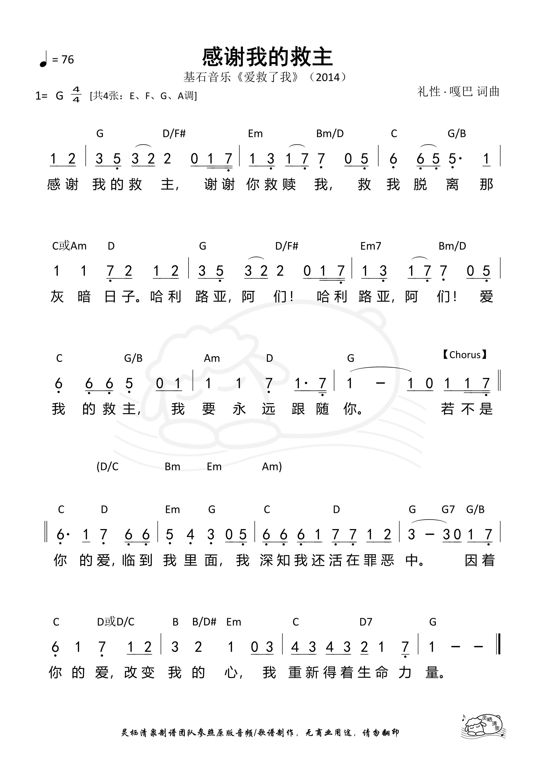 词曲:礼性·嘎巴 歌手:基石音乐 专辑:爱救了我 发行:2014 Verse 感谢我的救主 谢谢你救赎我 救我脱离 那灰暗日子 哈利路亚阿们 哈利路亚阿们 爱我的救主 我要永远跟随你 Chorus 若不是你的爱 临到我里面 我深知我还活在罪恶中 因着你的爱 改变我的心 我重新得着生命力量